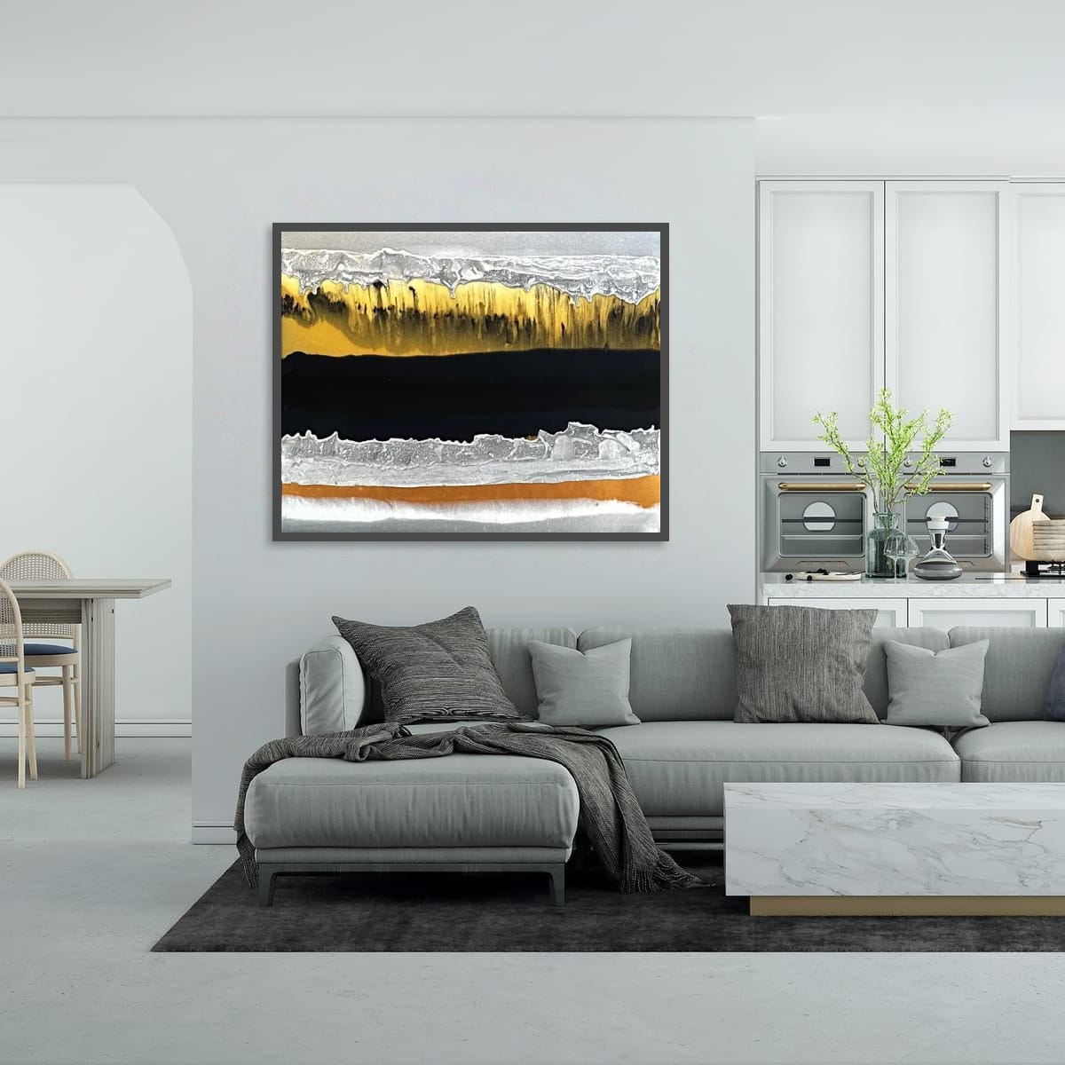 This piece creates a dramatic contrast between fiery yellow and molten black, bordered by silvery textures that feel like cooled lava. It evokes the image of a glowing horizon or a tectonic rift—balanced between chaos and calm.