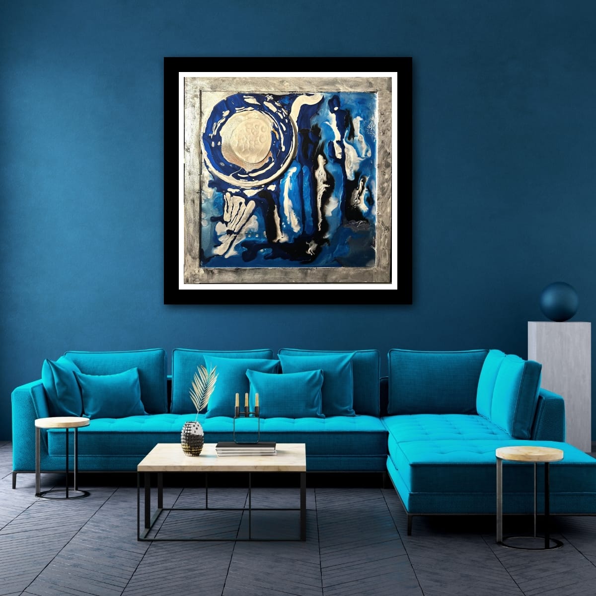 A glowing moon-like circle floats in a sea of deep blues and shimmering silvers. Abstract waves and forms below evoke reflections on water, creating a calm yet mysterious energy